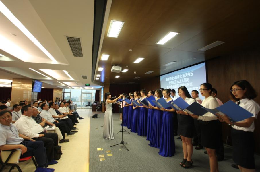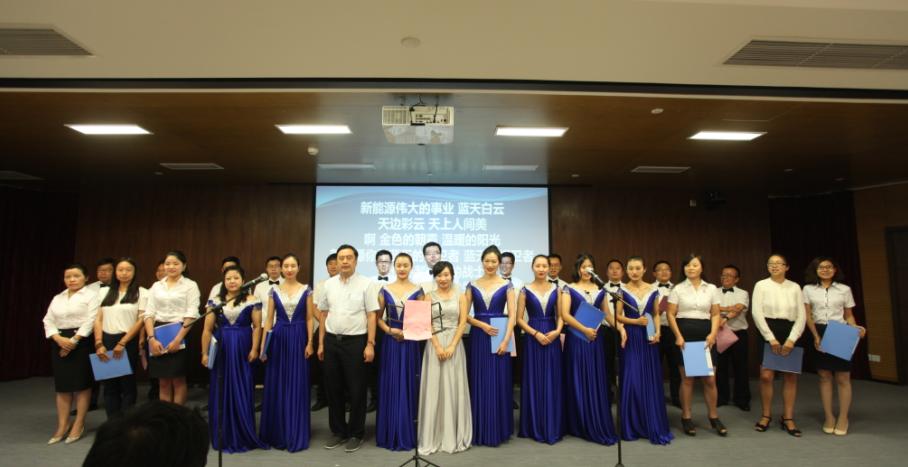 最后,由本次峰会会务组与天津区的干部联袂合唱《新能源之歌》,首次隆重推出这首即将唱响新能源行业、唱响无锡、唱响全国的歌曲。这首歌曲由赵振元同志作词,著名作曲家彭涛作曲,反应了新能源建设者对新能源这项造福子孙后代的伟大事业的热爱,表达了建设者们奋进在新能源道路上,走向光明的决心与勇气。合唱团队服装整齐、意气风发、慷慨激昂的演唱赢得了与会干部的热烈掌声。