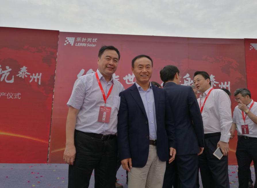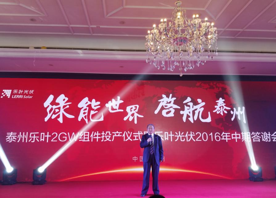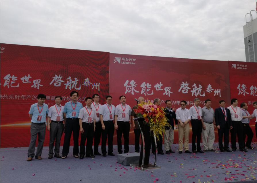 2016年9月6号,细雨绵绵,彩旗飘展,江苏泰州市海陵区隆基乐叶2GW太阳能电池组件一体化项目举行隆重的投产仪式。隆基股份董事长钟宝申发表主旨演讲。国务院参事、中国可再生能源学会理事长石定寰、国家发改委国际新能源研究所所长王进、招商新能源CEO李原、泰州市海陵区徐克俭书记等先后发表了热情洋溢的讲话。充分肯定了泰州乐叶建设的高速度、产能的高效化、盛赞隆基股份已成为国际单晶硅、硅片、电池、组件的最大供应商之一。